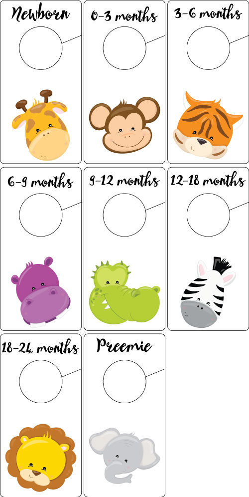The animal faces are adorable, gender neutral, and on a white background so they don't take all your ink. They're such an effortless way to keep your baby's wardrobe organized! There are 8 tags: newborn, 0-3 months, 3-6 months, 6-9 months, 9-12 months, 12-18 months, 18-24 months, and preemie.