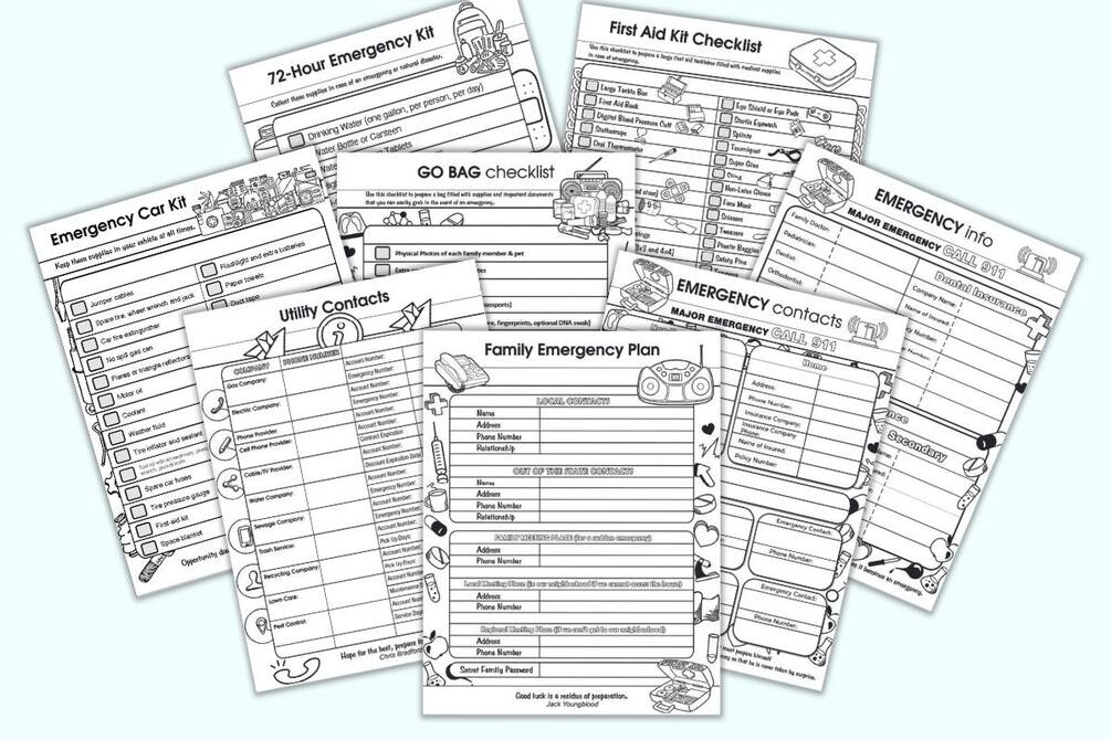 This listing is for an 8 page emergency planner including checklists and emergency contact information.