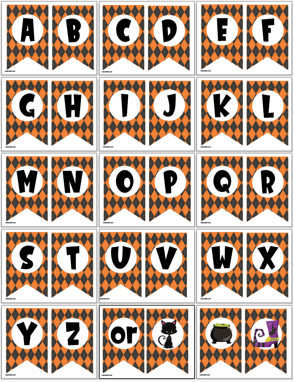 This Halloween banner features the full alphabet (A-Z) and four bonus pendants: one with a black cat, one with a bubbling cauldron, another with a purple witch's boot, and a fourth with the word "or" for your Trick or Treat banner!